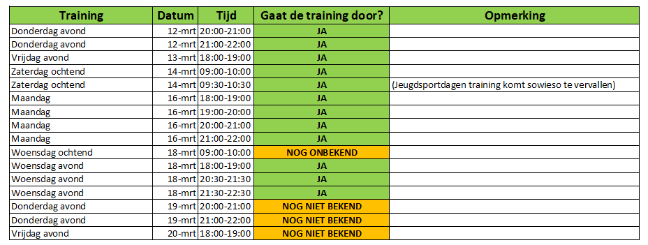Iedere dag zal hier tussen 14:00 en 15:00 uur aangegeven worden wat de huidige status is aangaande de trainingen.